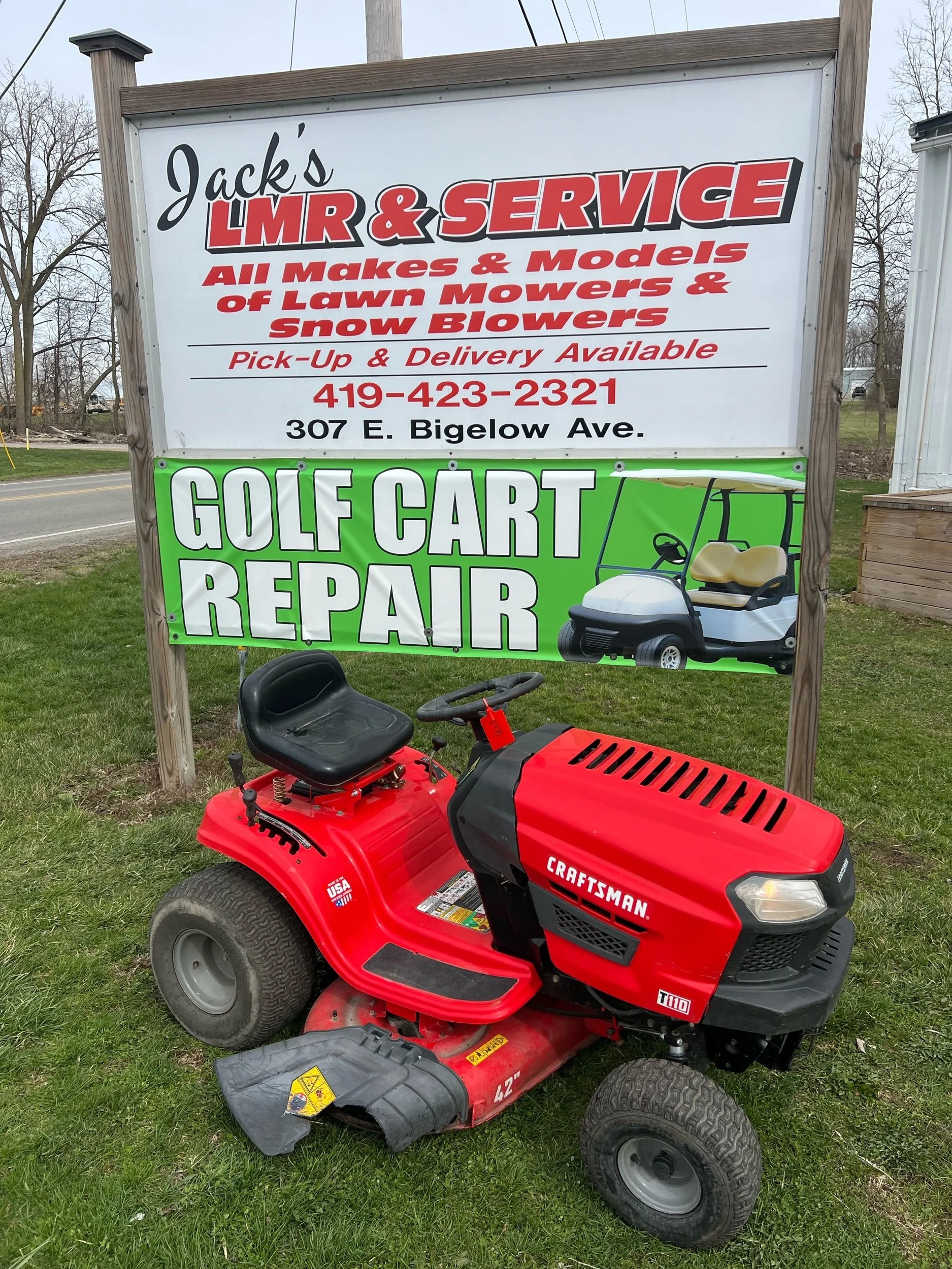 Craftsman 42 inch. Runs good. $975 plus tax. Located at Jacks lawnmower shop at 307 E. Bigelow Ave. Findlay Ohio open Monday through Friday 9 to 430 and Saturday 9-1. Delivery is available at buyers expense. All units come with warranty 419-423-2321. Trade-ins are welcome. If you would like to purchase over the phone for delivery, please ask for Blake. We have over 100 units in stock.