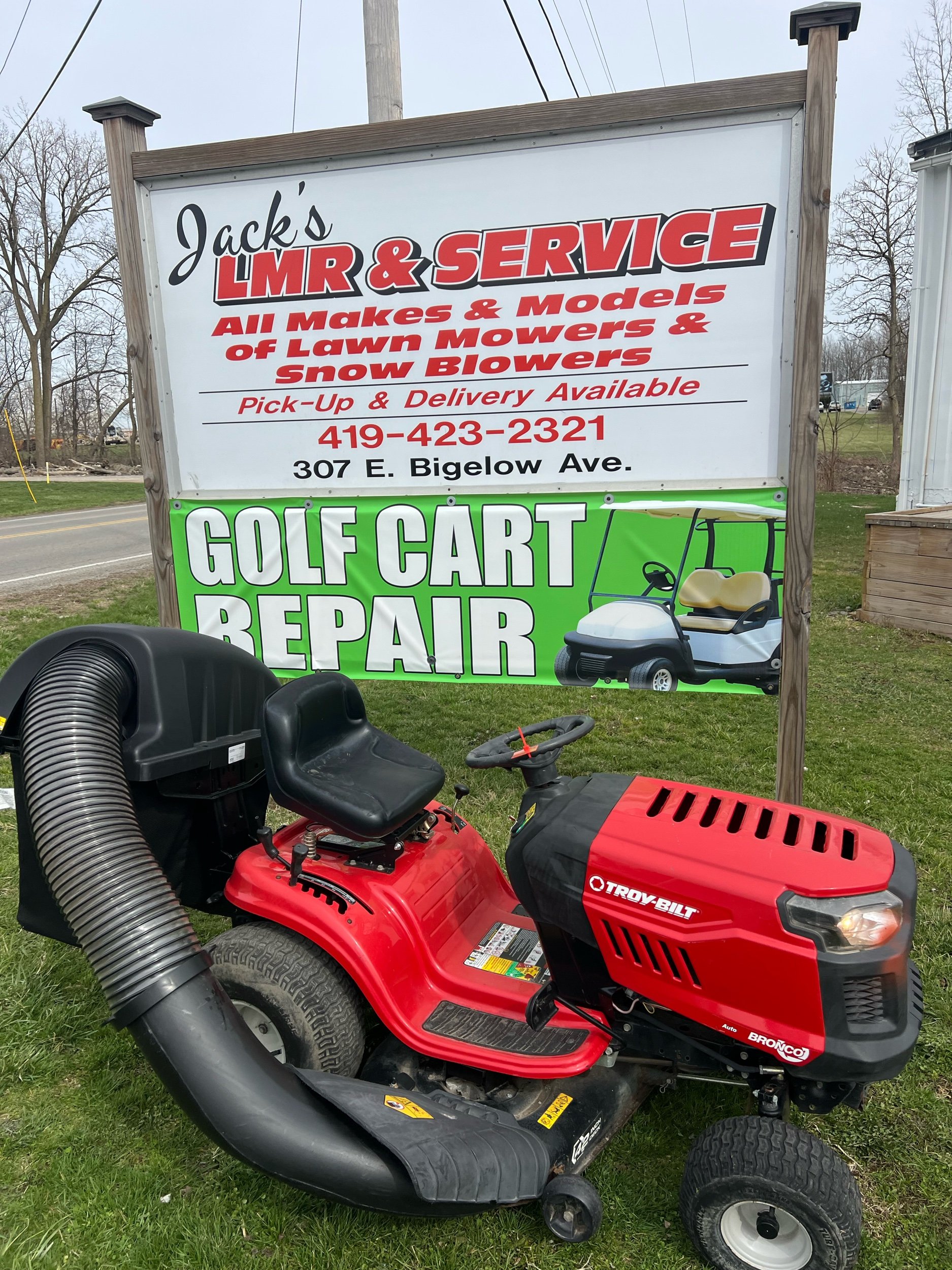Troy bilt bronco with bagger runs great! $1299 plus tax. Located at Jacks lawnmower shop at 307 E. Bigelow Ave. Findlay Ohio open Monday through Friday 9 to 430 and Saturday 9-1. Delivery is available at buyers expense. All units come with warranty 419-423-2321. Trade-ins are welcome. If you would like to purchase over the phone for delivery, please ask for Blake. We have over 100 units in stock.